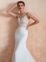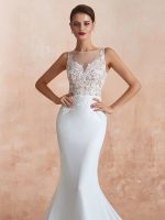 Beautiful Mermaid Sleeveless Lace Appliqued Beach Bridal Gown with Train