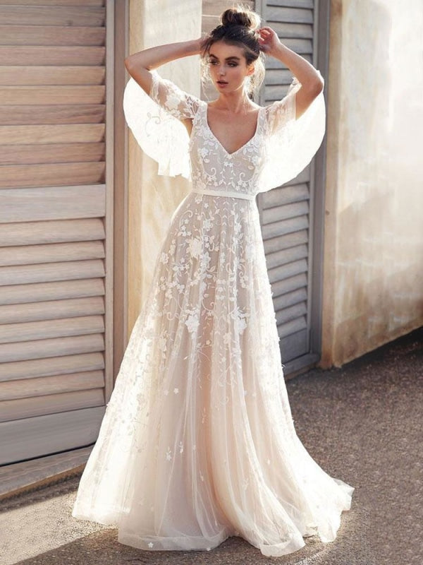 Beautiful White Lace A-Line Wedding Dress with V-Neck and Short Sleeves