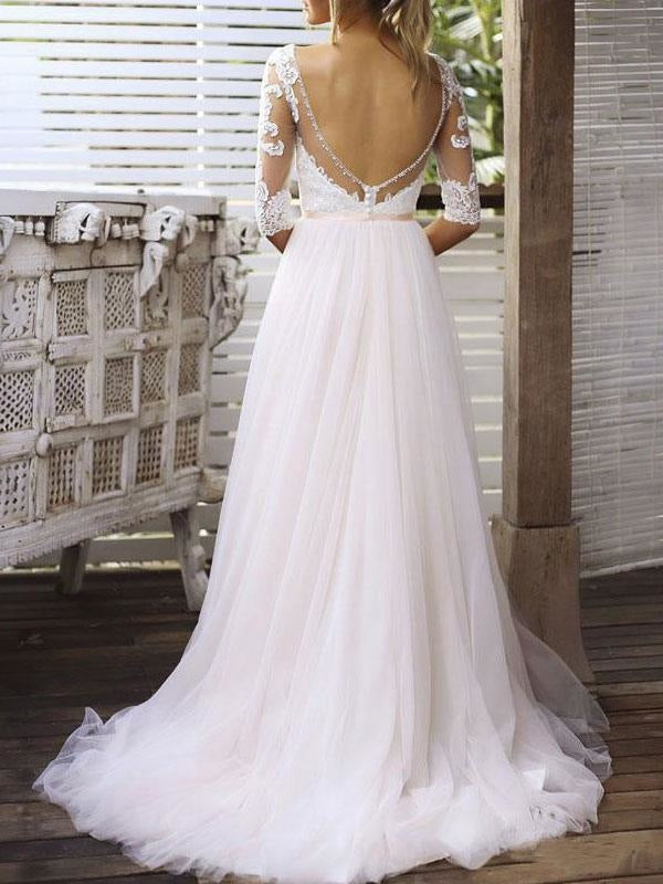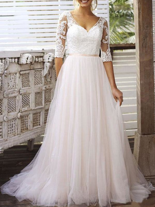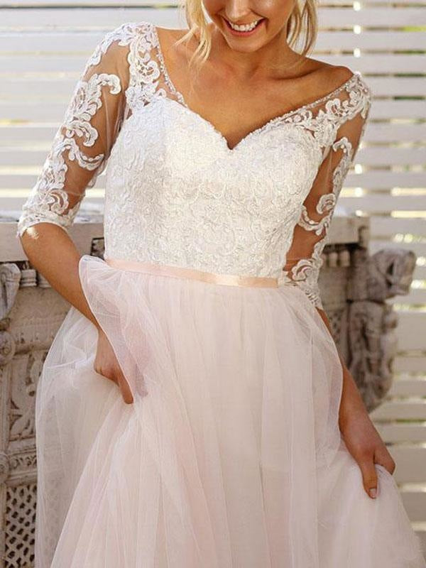 Charming A-Line V-Neck Half Sleeves Lace Tulle Bridal Dress with Train