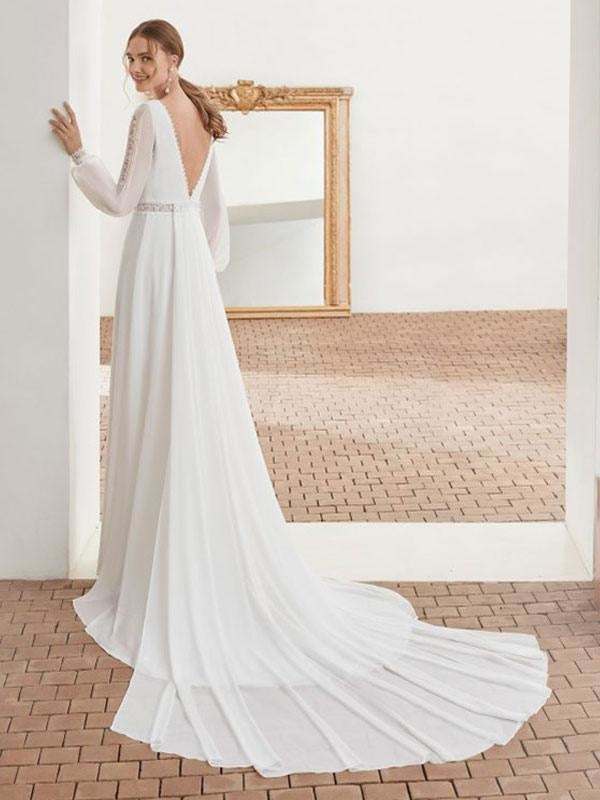 Chiffon Halter Bridal Dresses with Long Sleeves Lace Details and A-Line Silhouette with Train