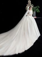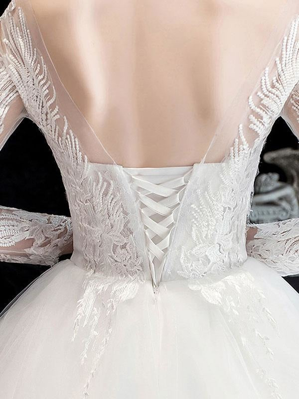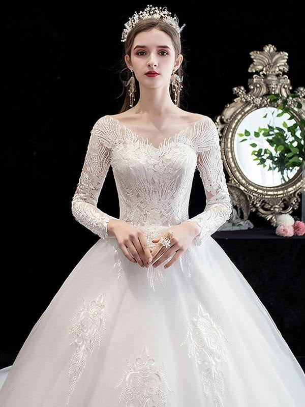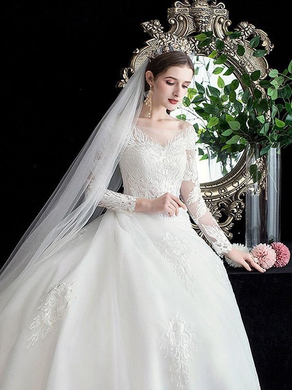 Classic Ball Gown Cathedral Train Jewel Neck Bridal Dress with Natural Waist and Applique Details