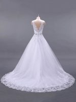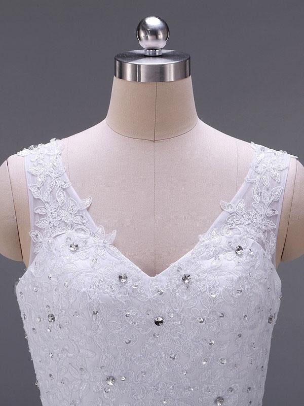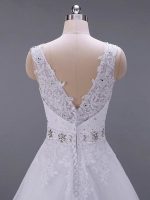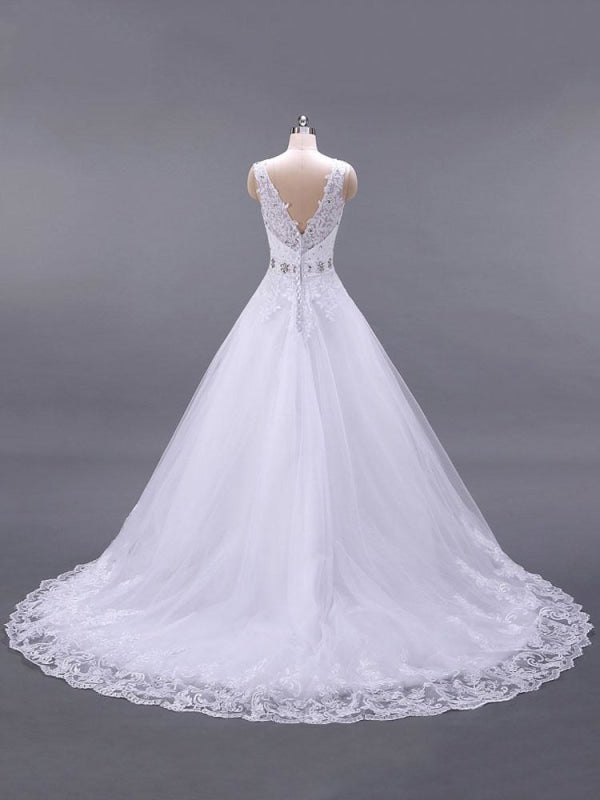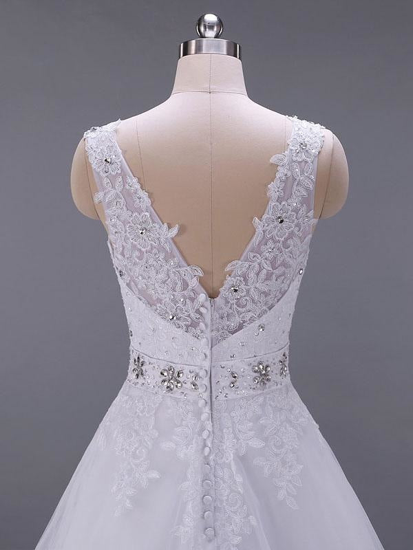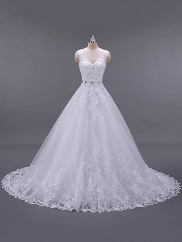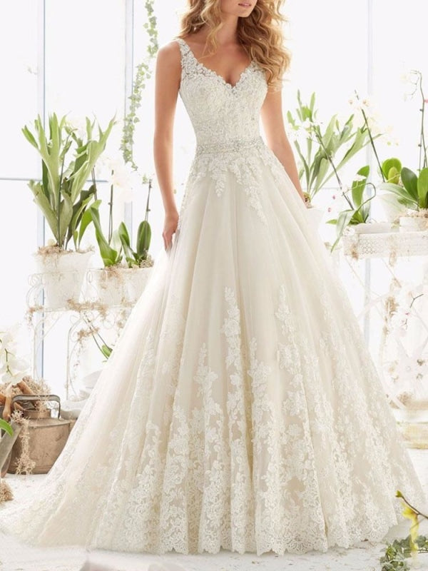 Classic V Neck Sleeveless A-Line Lace Beaded Bridal Gown with Sash