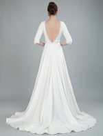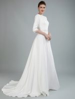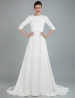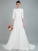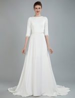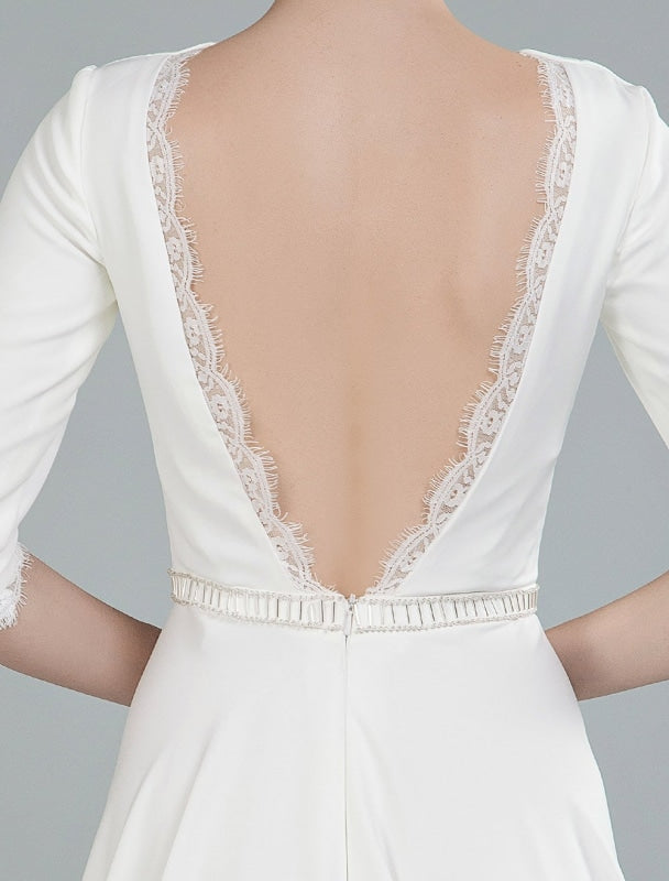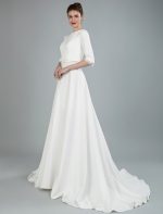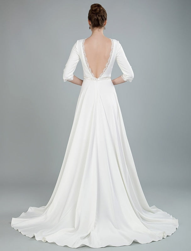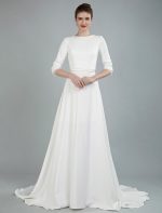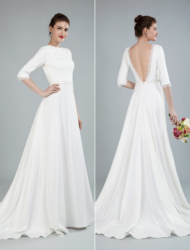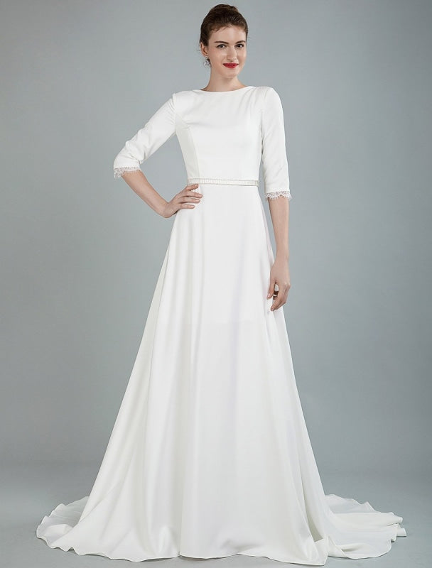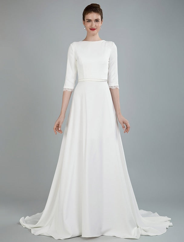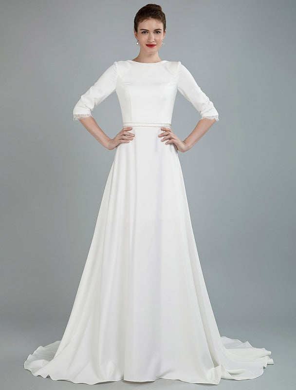 Court Train A-Line Bridal Gowns with Bateau Neck Half Sleeves and Beaded Sash
