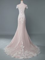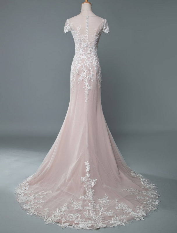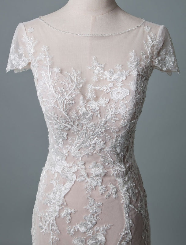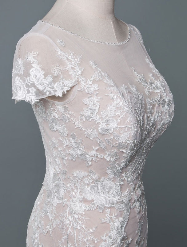 Customized Lace Bridal Gowns with Mermaid Silhouette Jewel Neckline and Short Sleeves in Floor Length