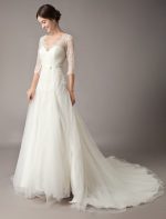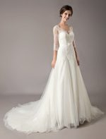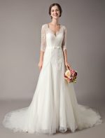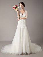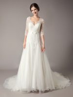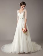 Be the first to review “Elegant Ivory V Neck Lace Tulle Sleeveless Bridal Gown with Train”