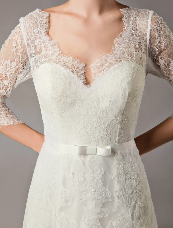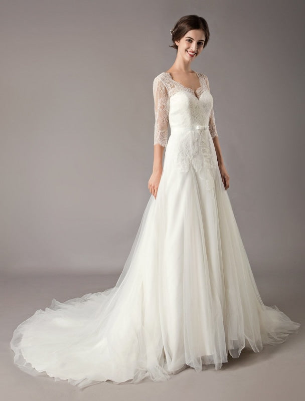 Elegant Ivory V Neck Lace Tulle Sleeveless Bridal Gown with Train