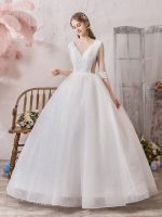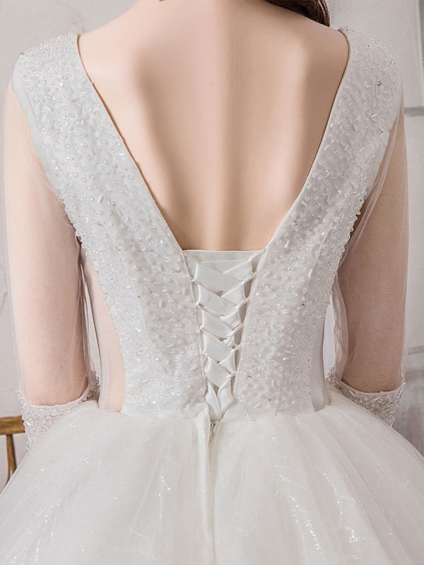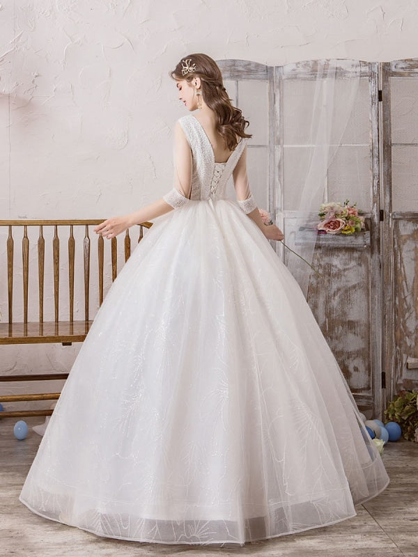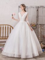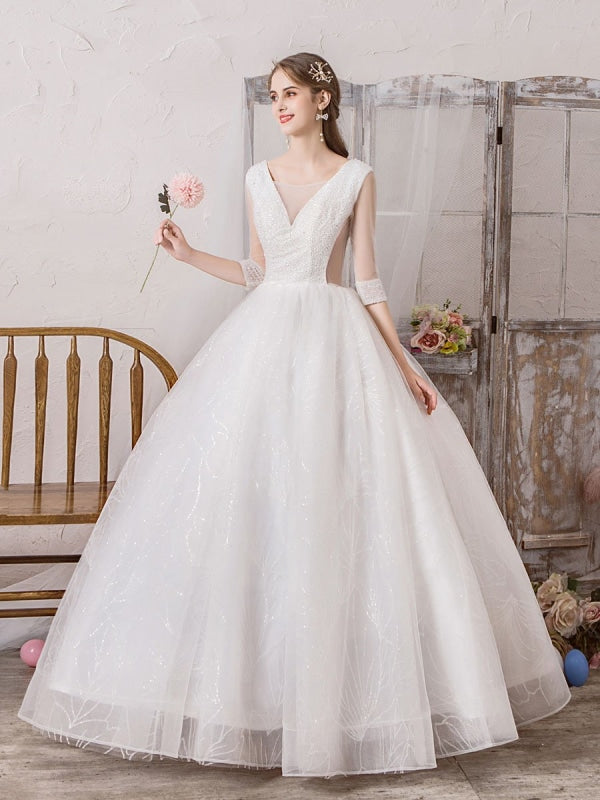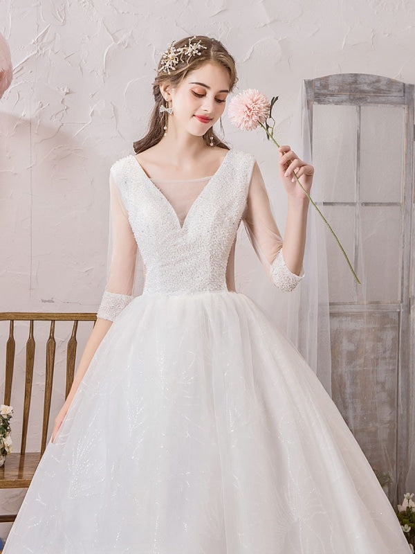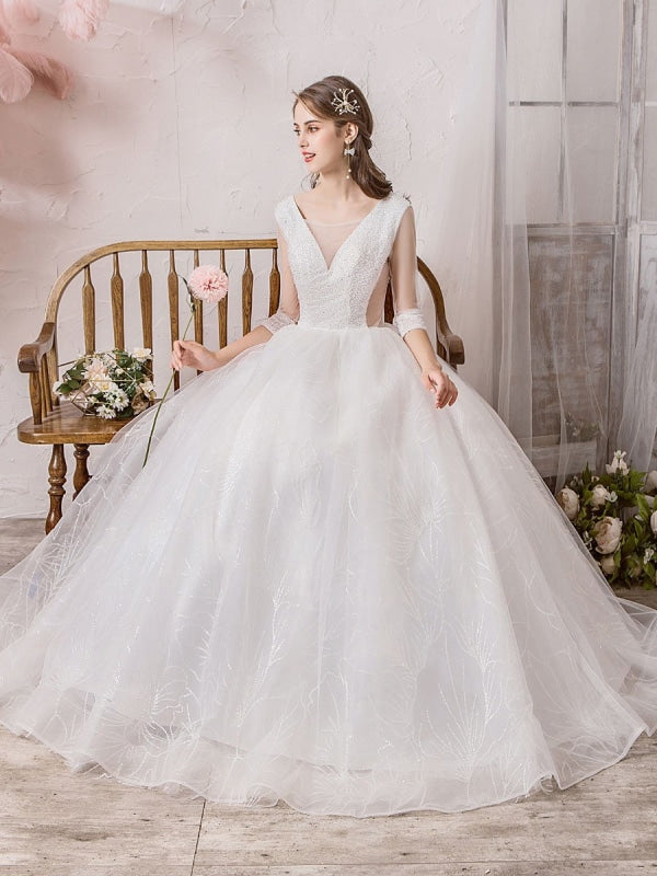 Elegant Princess Silhouette Floor Length V-Neck Sleeveless Natural Waist Beaded Lycra Spandex Bridal Gown