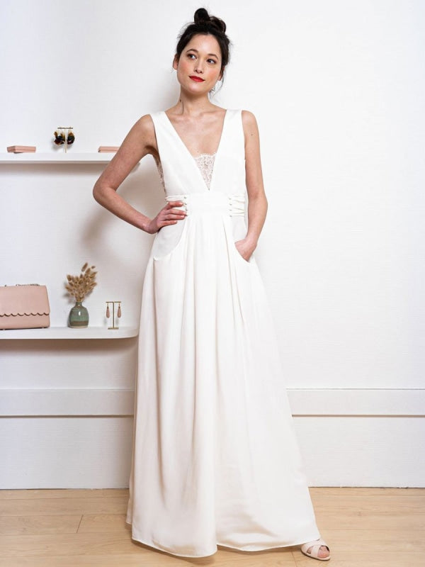 Elegant White A-Line Bridal Dress with Backless Design and V-Neck Sleeveless