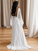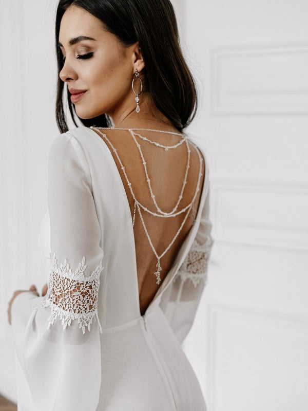 Elegant White Satin Fabric A-Line Bridal Gown with V-Neck Long Sleeves Backless Style and Chains