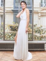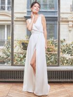 Be the first to review “Elegant White Satin V-Neck Sleeveless A-Line Bridal Gown with Split and Buttons”