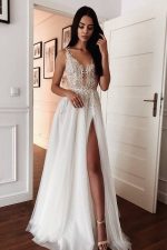 Enchanting White Lace V-Neck Summer Wedding Dress with High Split