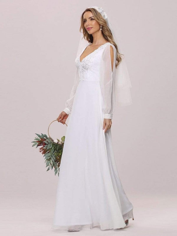 Exquisite White V-Neck Chiffon A-Line Wedding Dress with Long Sleeves