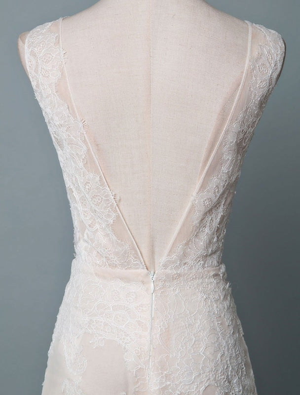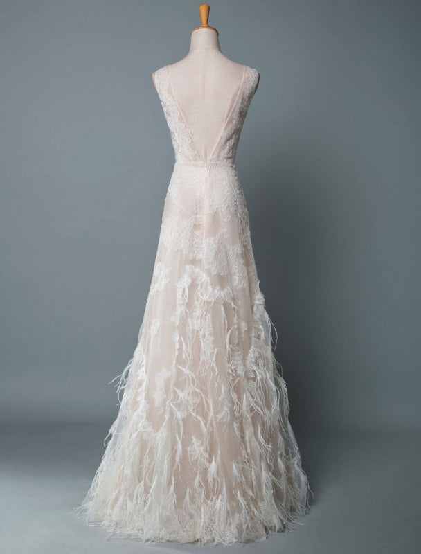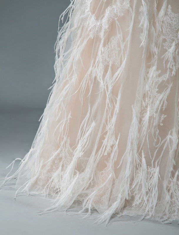 Feather Bridal Gowns with A-Line Silhouette V-Neckline and Beaded Sleeveless Design