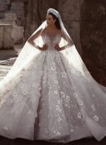 Floral Bridal Gowns with Luxurious Beading Sheer Neck and Long Sleeves Ball Gown Wedding Dresses