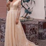 Floral Lace Wedding Dress with Sleeves and V Neck in Long A-Line Style