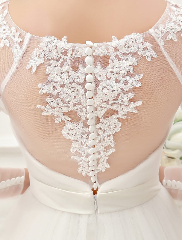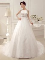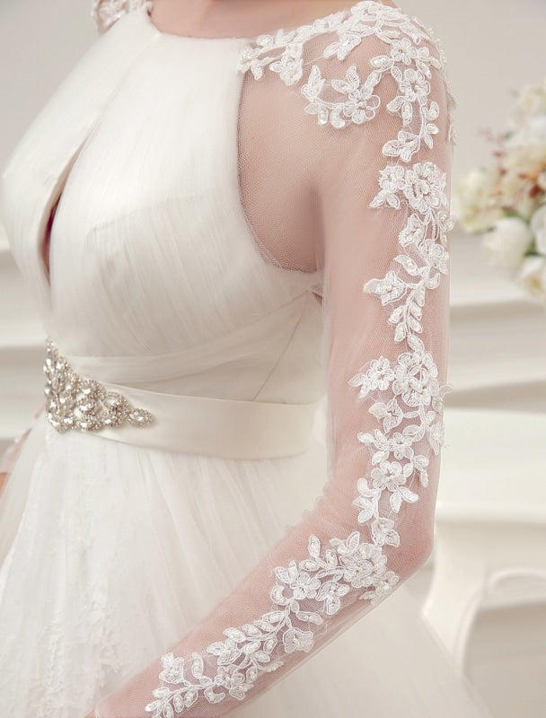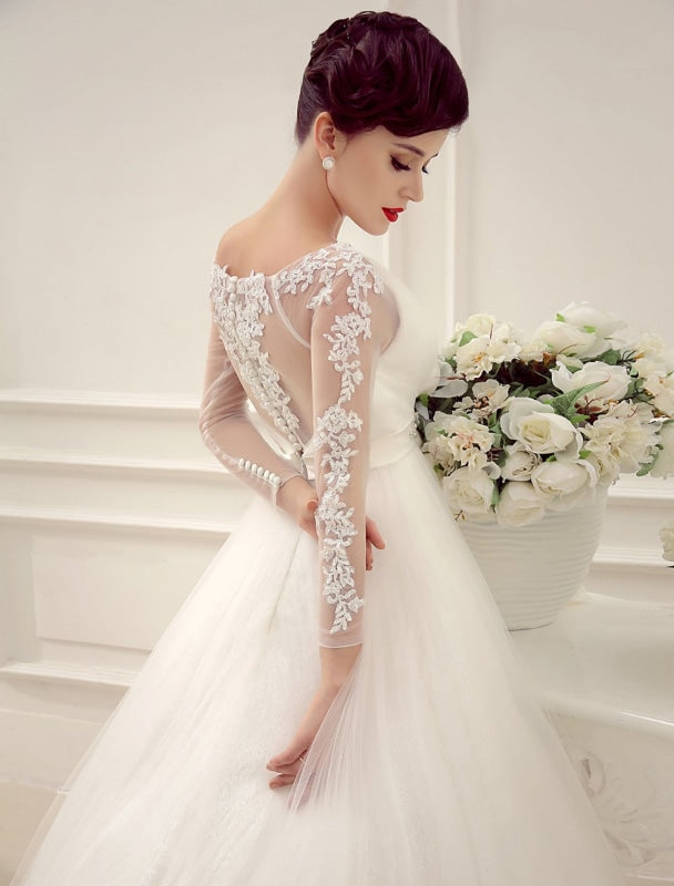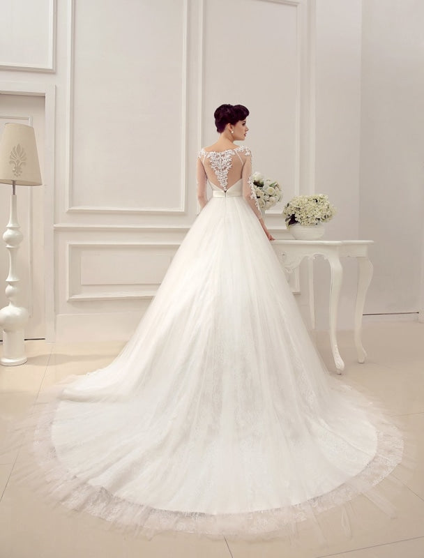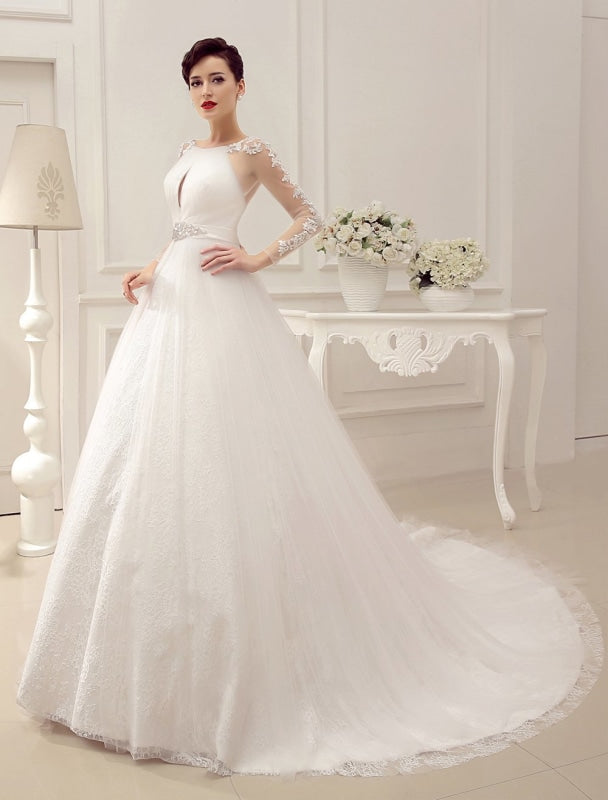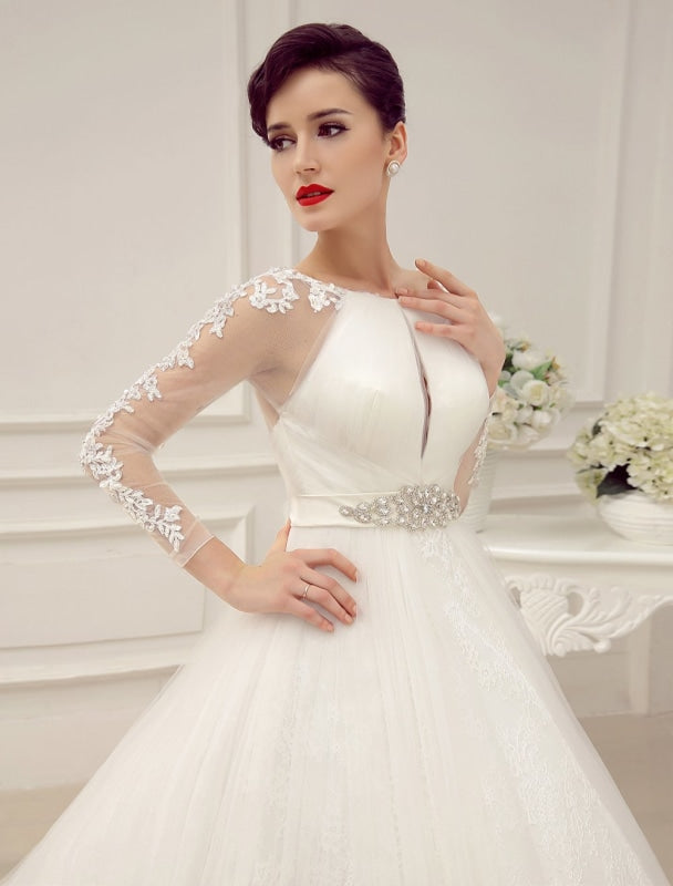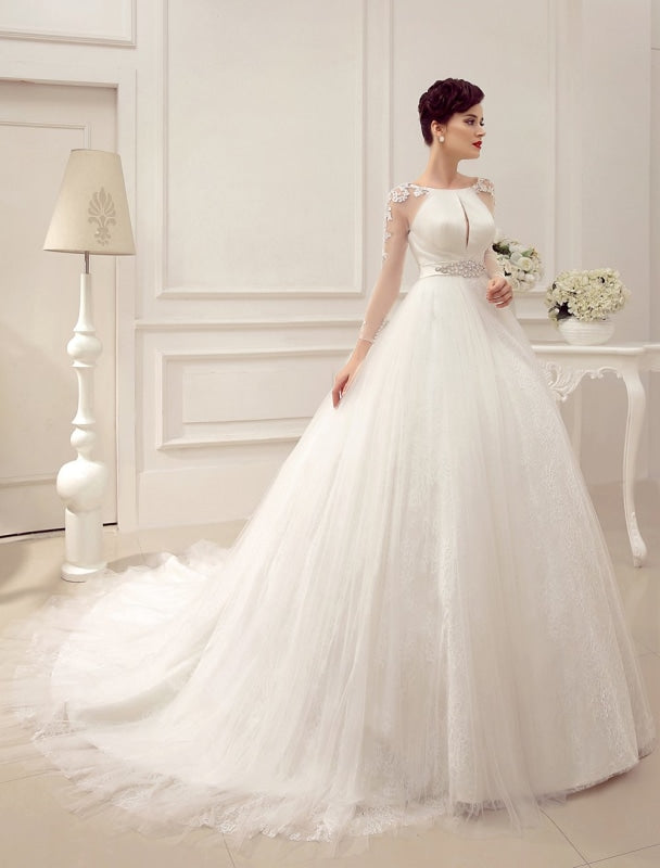 Gorgeous Ball Gown Long Sleeve Lace Applique Beaded Wedding Gown with Train