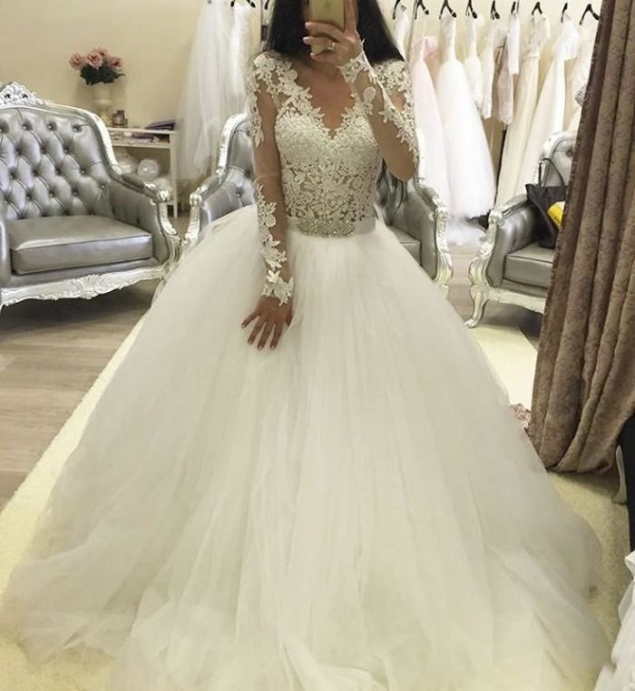 Gorgeous Ball Gown Sleeves V-Neck Tulle Princess Long Wedding Dress