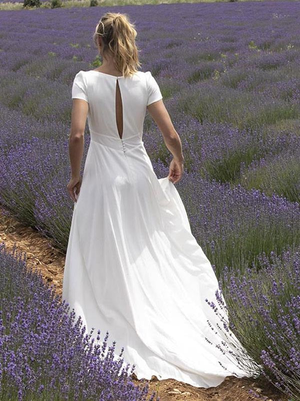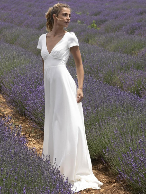 Gorgeous V-Neck Short Sleeves Buttons Floor Length Bridal Dress with Train