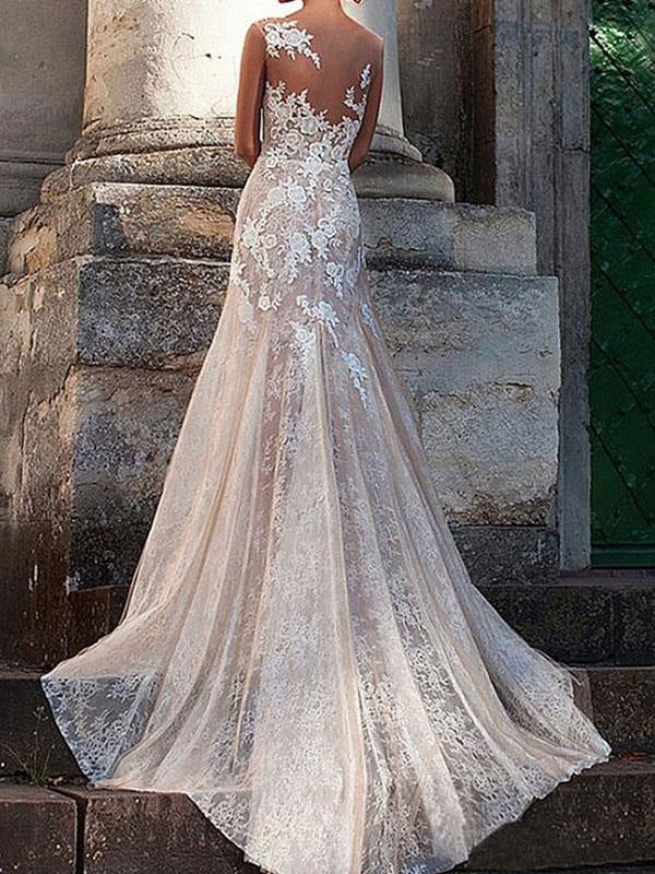 Graceful Sheath V-Neck Sleeveless Floor Length Lace Tulle Backless Bridal Dress with Train