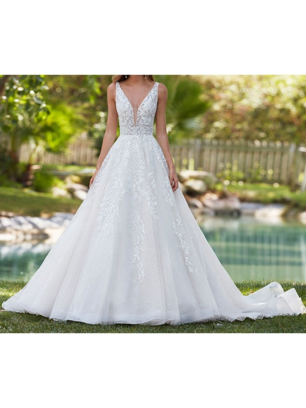 Graceful White Lace Off-Shoulder Floor-Length Bridal Dress with Applique and Train
