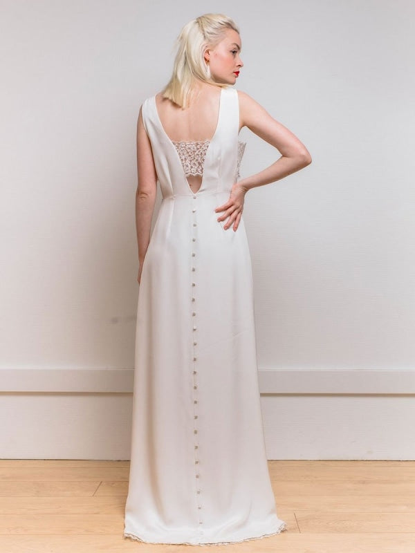 Graceful White V-Neck Backless Buttons Satin Fabric A-Line Bridal Dress