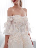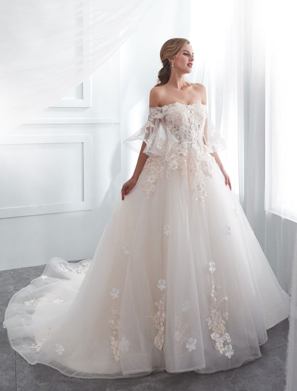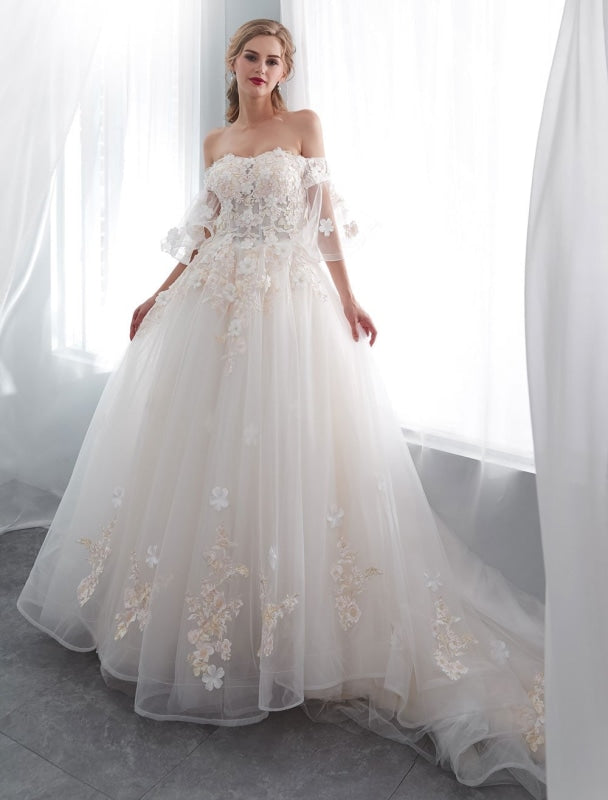 Half Sleeve Off Shoulder Princess Wedding Dress with Lace Flowers Pearls and Applique