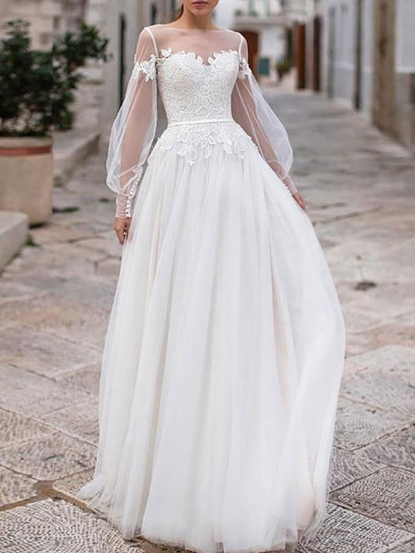Illusion Neck Long Sleeve Lace Applique Boho Wedding Gown
