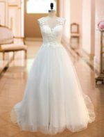 Ivory A-Line Illusion Neck Sleeveless Floor Length Lace Beaded Tulle Boho Bridal Gown