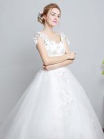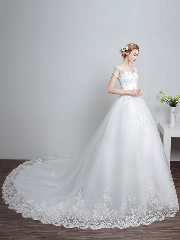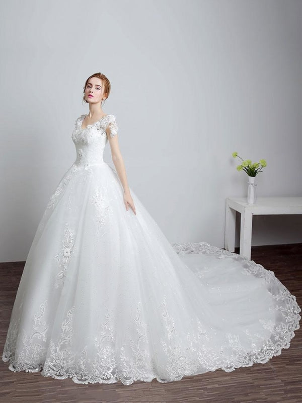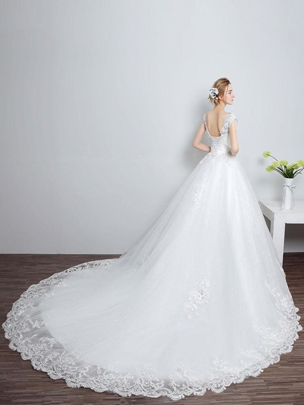 Ivory Backless Bridal Dress with Lace Applique V Neck and Long Train