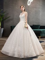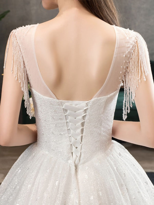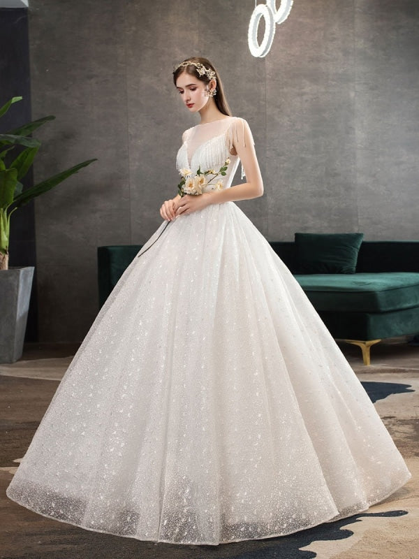 Ivory Illusion Neck Beaded Sleeveless Princess Wedding Dress with Floor Length Bridal Gown