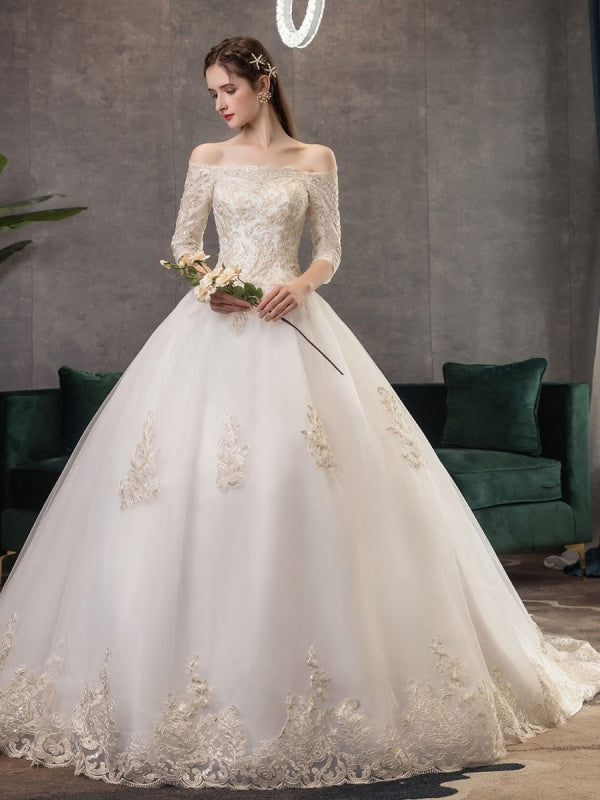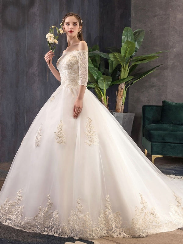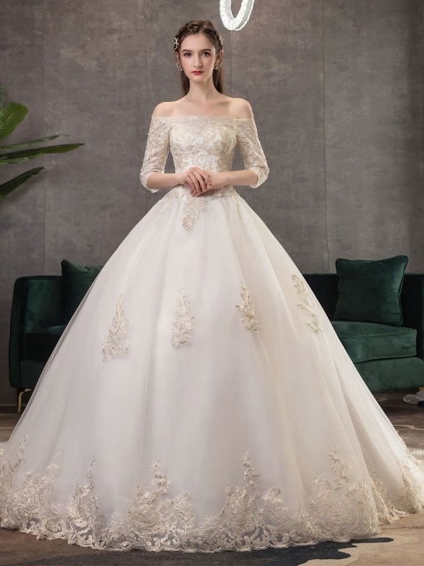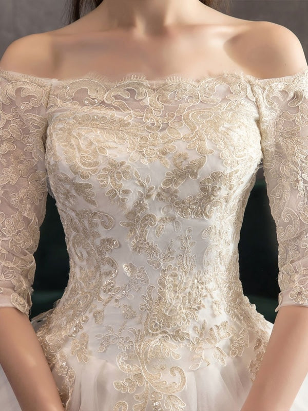 Ivory Lace Applique Half Sleeve Off The Shoulder Princess Bridal Gown with Train