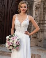 Long A-line V-neck Chiffon Lace Wedding dress with slit Simple and Alluring