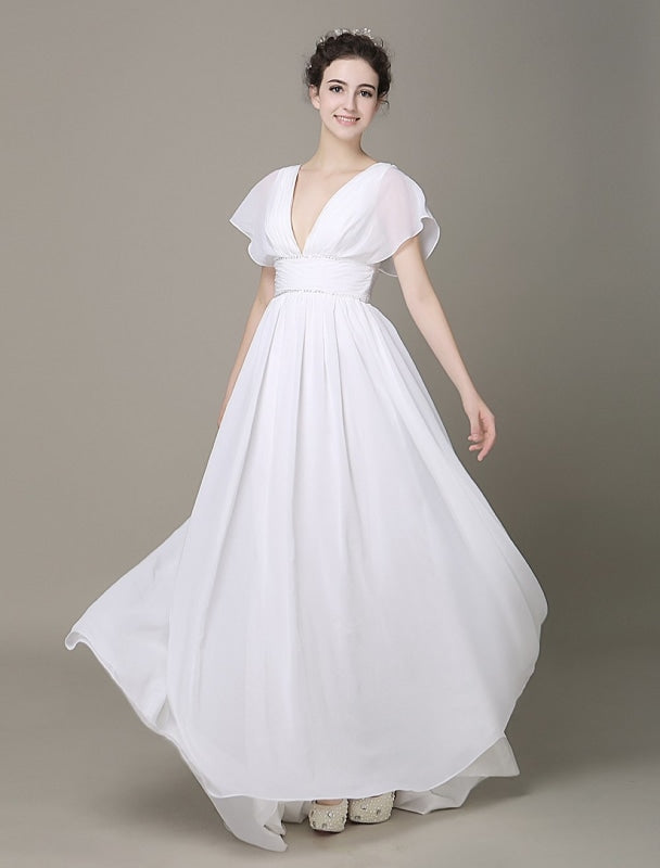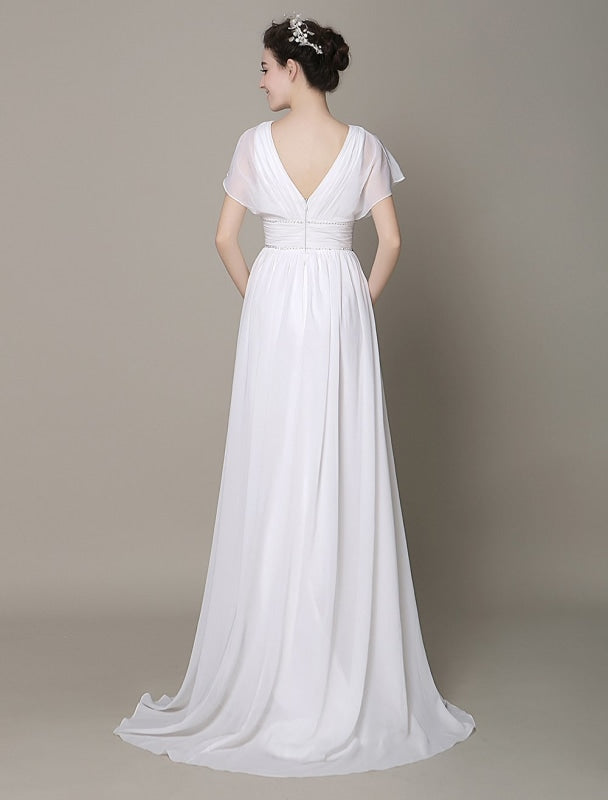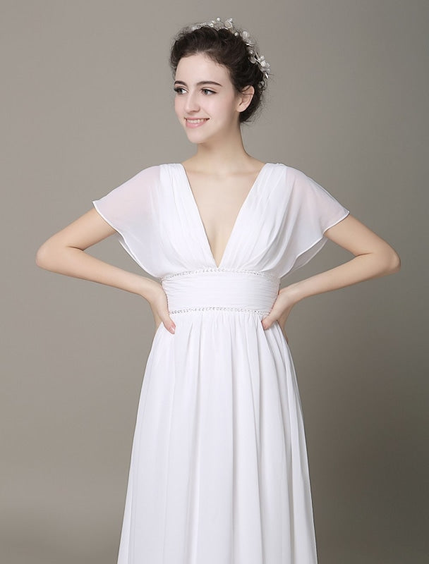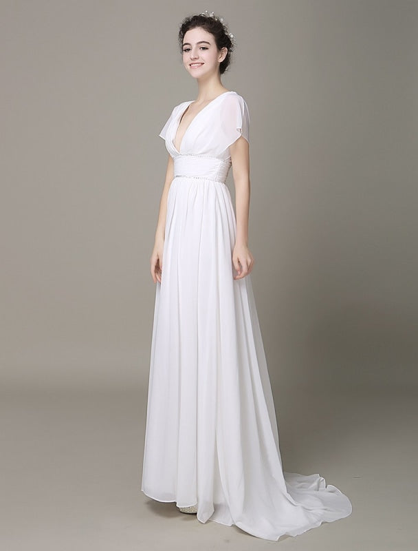 Plunging Chiffon Beach Wedding Dress with A-Line Silhouette Ivory V-Neck Pleated Belt and Short Sleeves