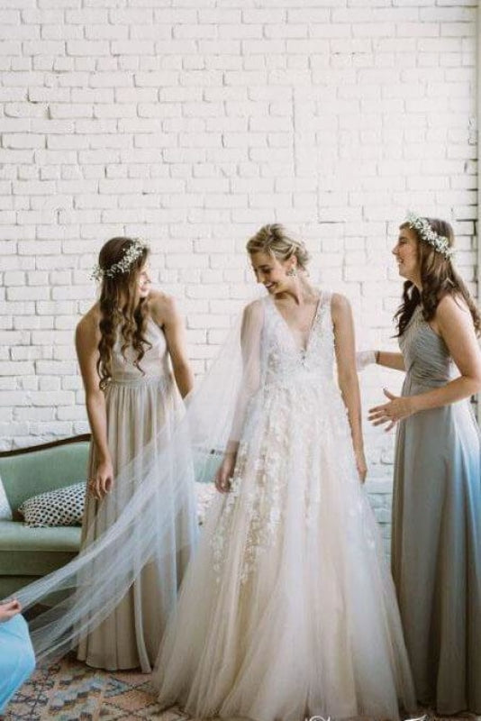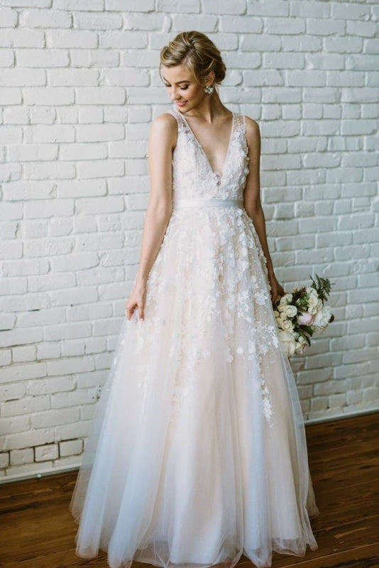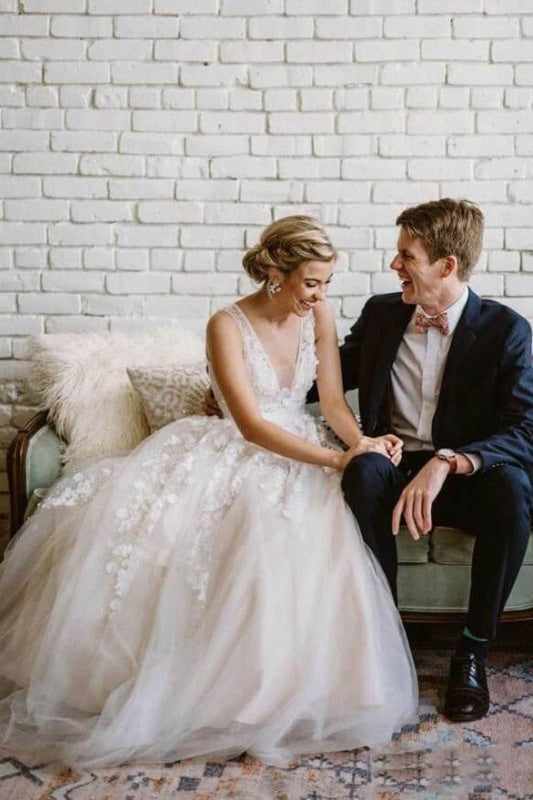 Puffy Tulle Wedding Dress with V-Neck and Lace AppliqueFloor Length