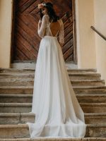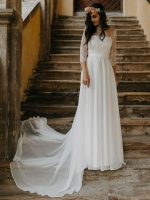 Romantic White Lace Chiffon A-Line Bridal Gown with Jewel Neck and Backless Design