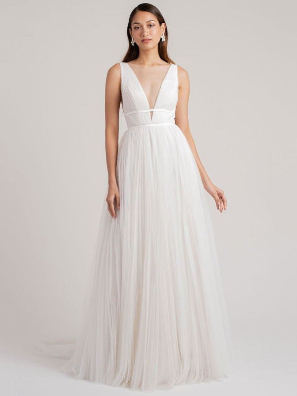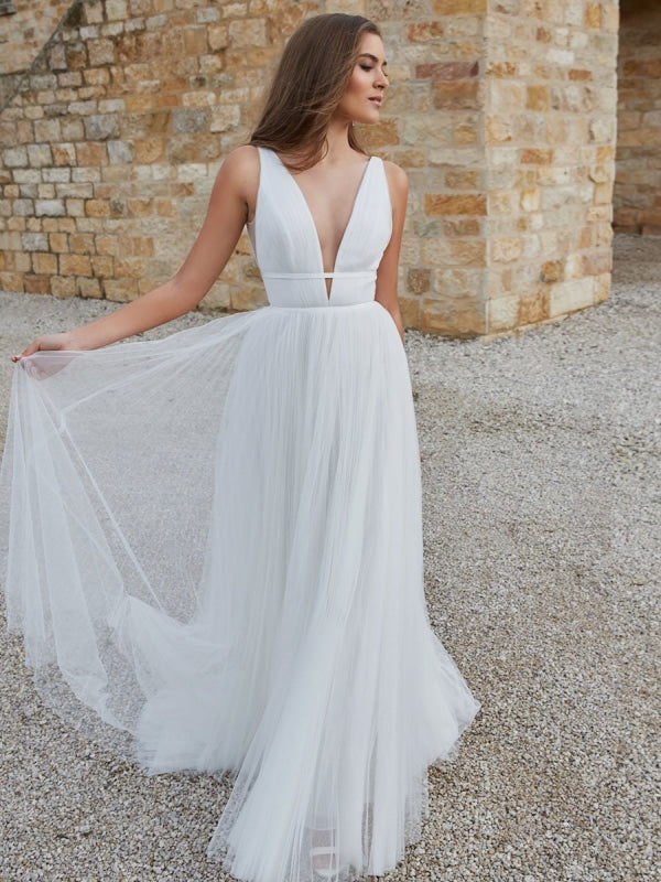 Romantic White V-Neck Sleeveless Pleated Tulle A-Line Bridal Gown