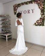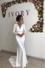 Be the first to review “Shining White V neck Mermaid Pearl Belt Court Train Open back Bridal Gown Simple and Glamorous”