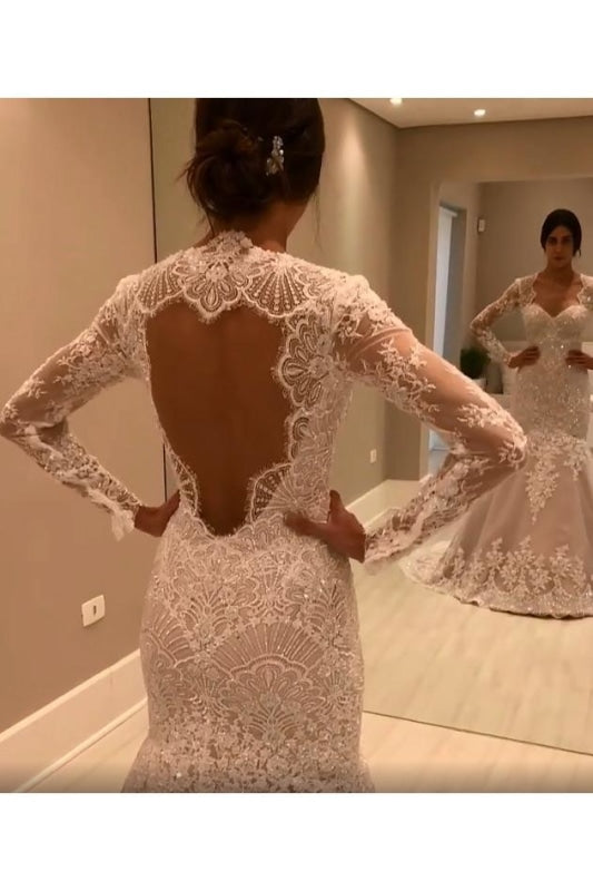 Sleeves Mermaid Long Open Back Wedding Dress Vintage Elegance