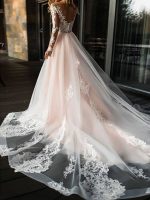 Stunning A-Line V-Neck Long Sleeve Lace Applique Tulle Bridal Gown with Chapel Train