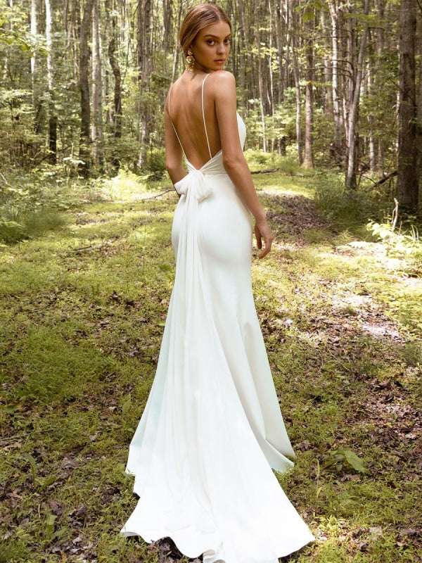 Stunning White Mermaid Bridal Dress with Spaghetti Straps Satin Fabric V-Neck and Ruffles