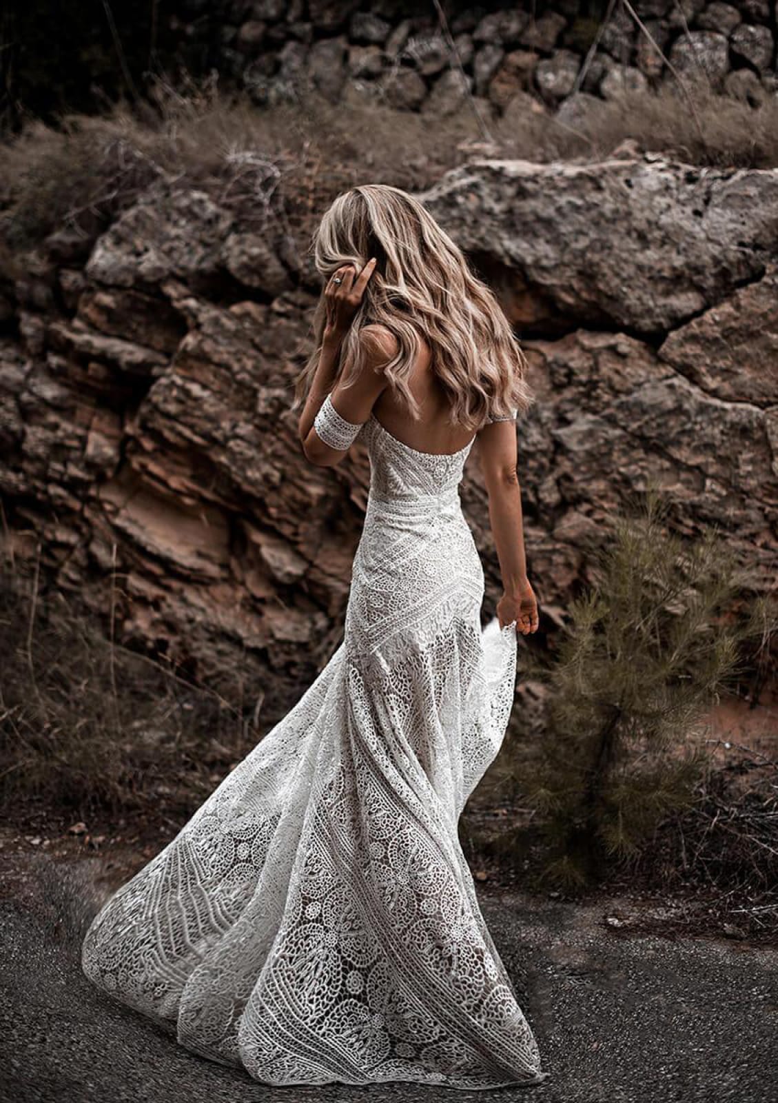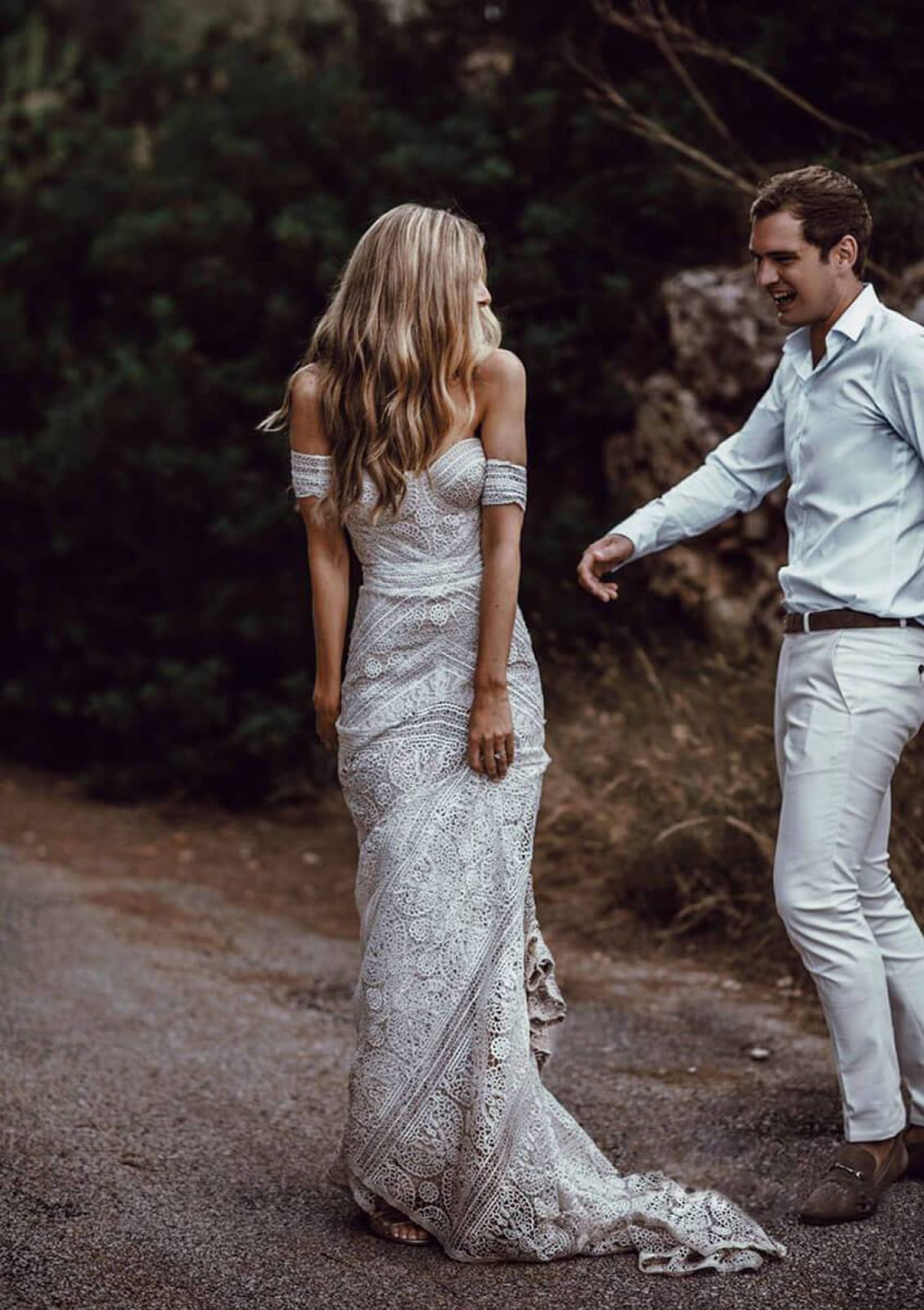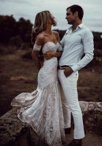 Sweep Train Lace Sheath/Column Off Shoulder Wedding Dress