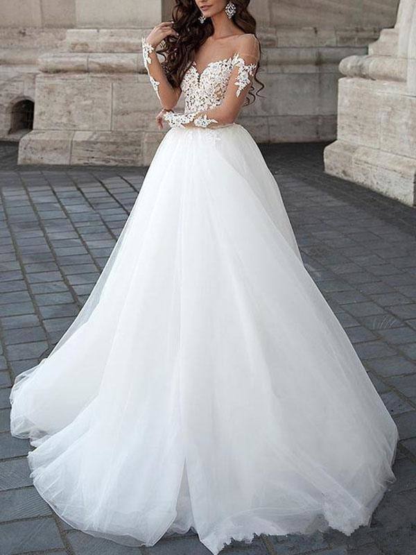Sweetheart Neck Ball Gown Princess Wedding Dress with Long Sleeves and Backless Lace Tulle