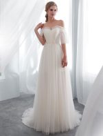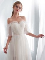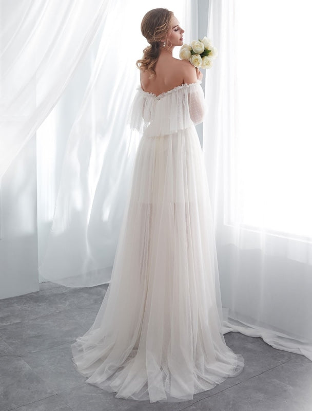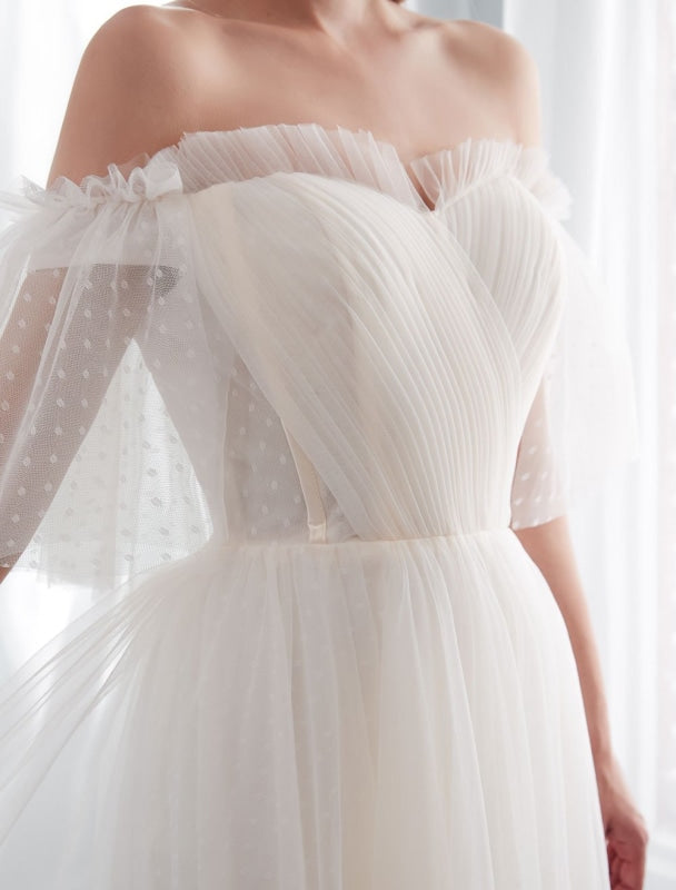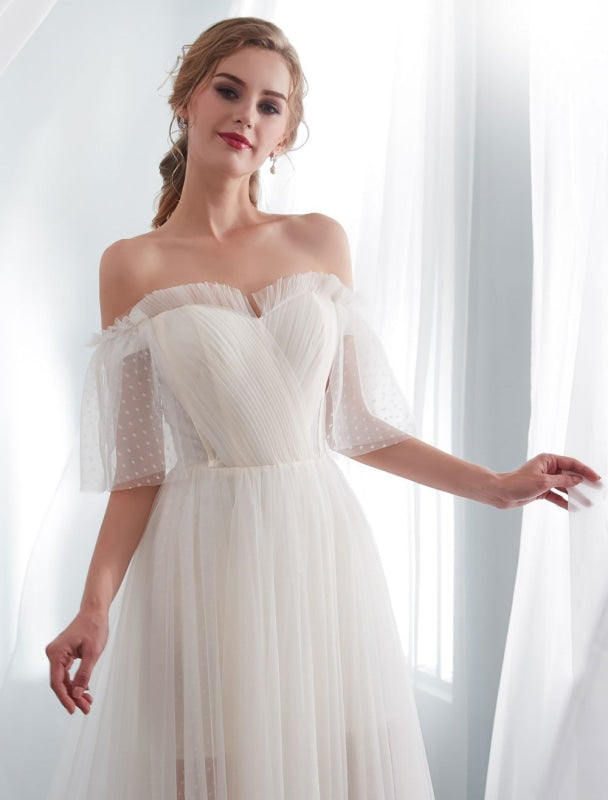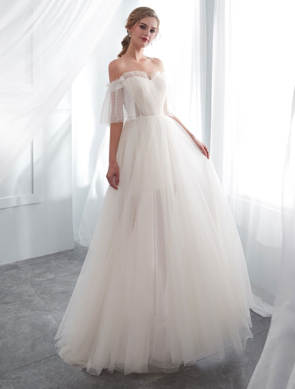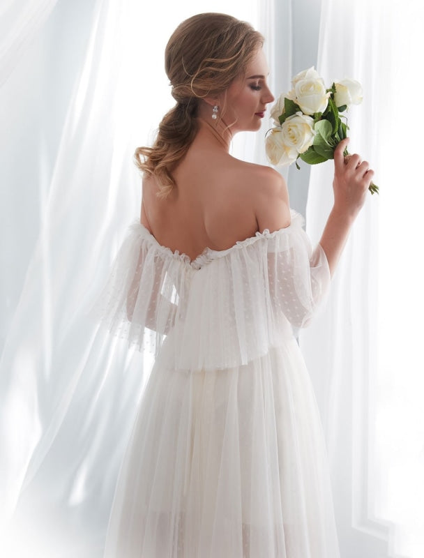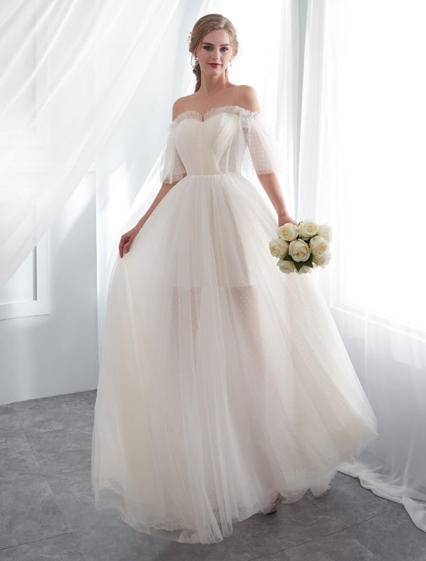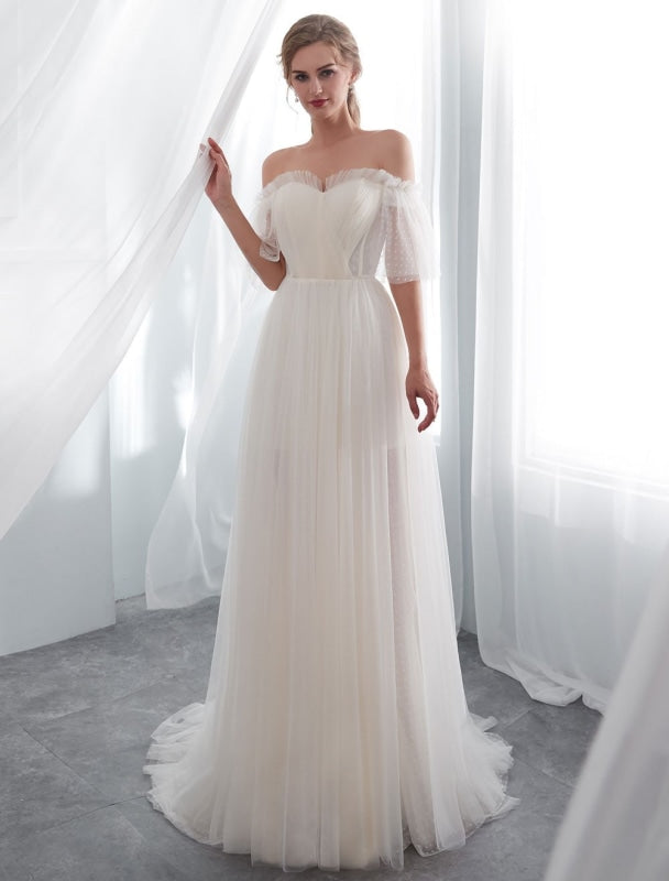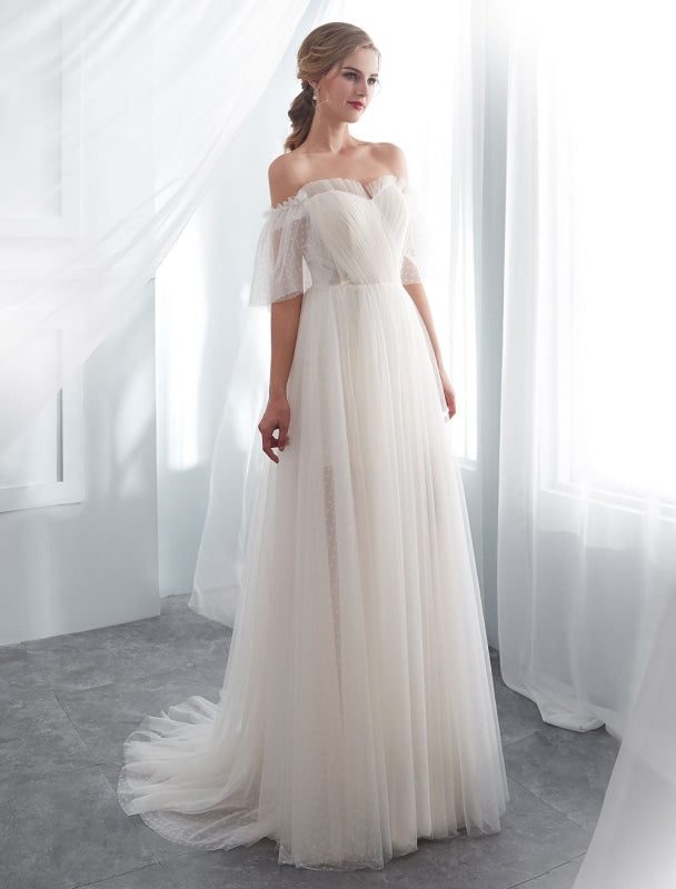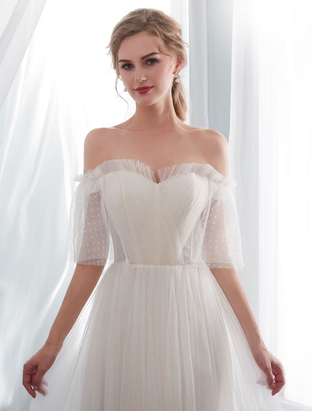 Tulle Beach Bridal Dress With TrainIvory Off Shoulder Half Sleeve Wedding Dresses