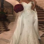 Tulle Lace Appliques Long Wedding Dress with Detachable Train featuring Off The Shoulder Sweetheart Neckline