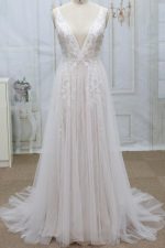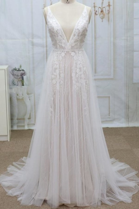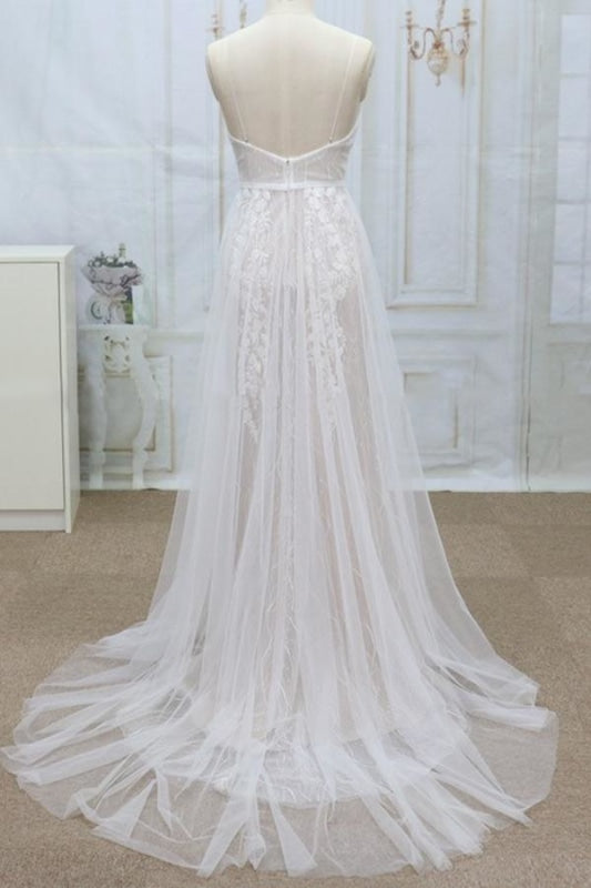 V-Neck Lace Tulle Wedding Dress with Spaghetti Straps