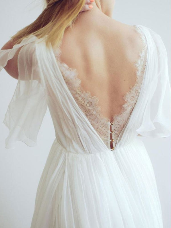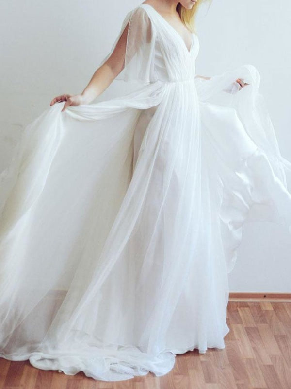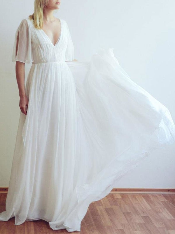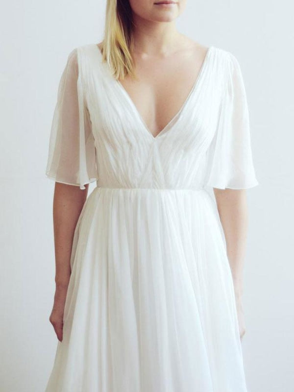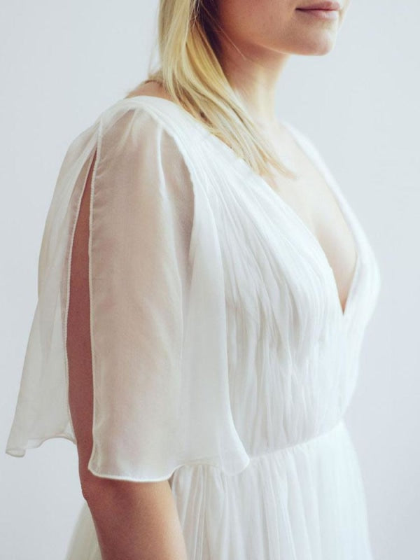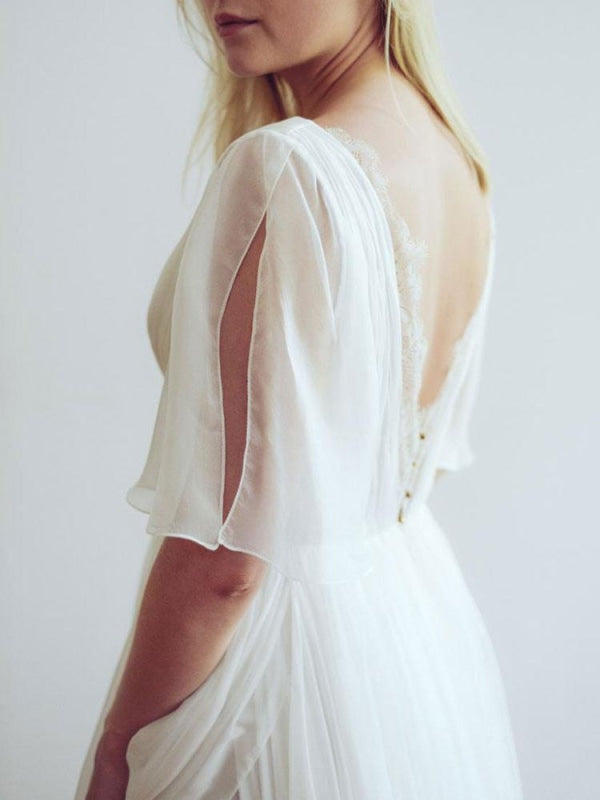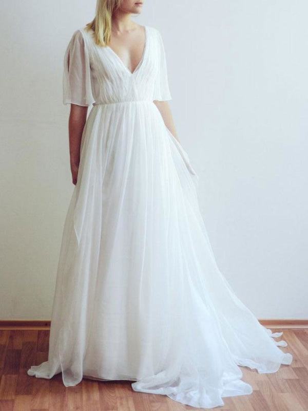 V-Neckline Bridal Dresses with Half Sleeves and Pleated A-Line Silhouette in Floor Length