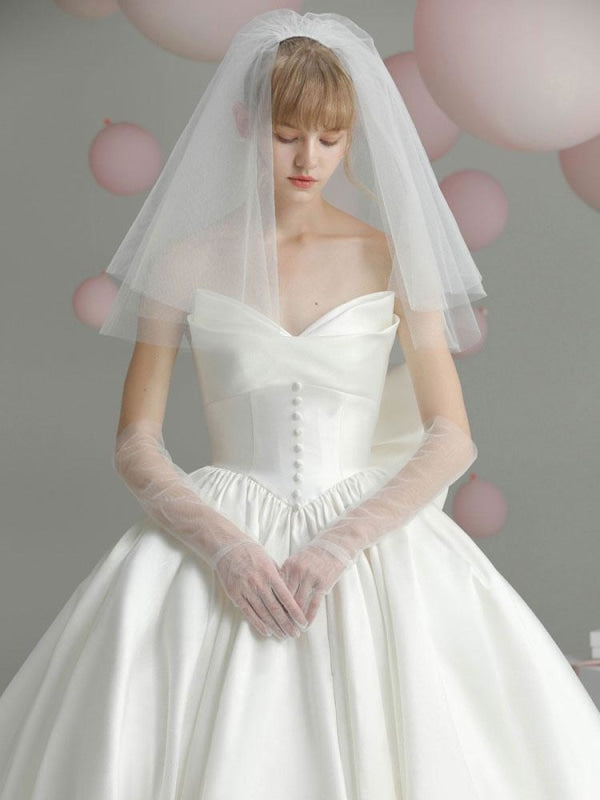Vintage Cathedral Train Strapless Sleeveless Satin Bridal Gown with Bows Classic Elegance