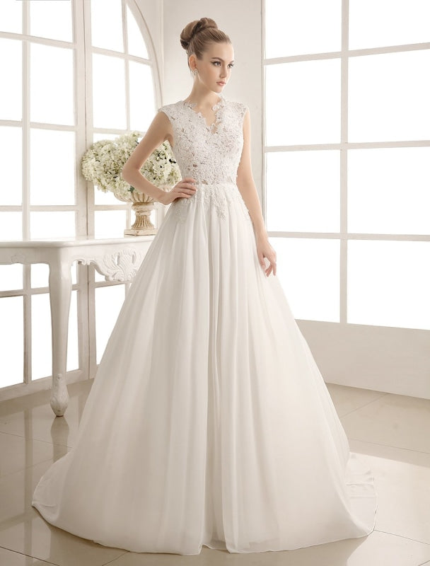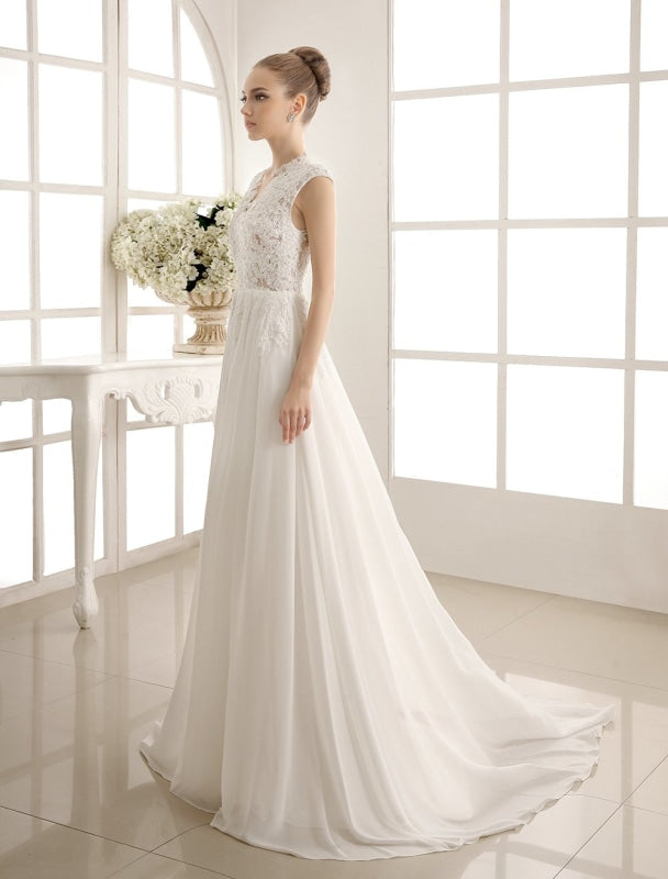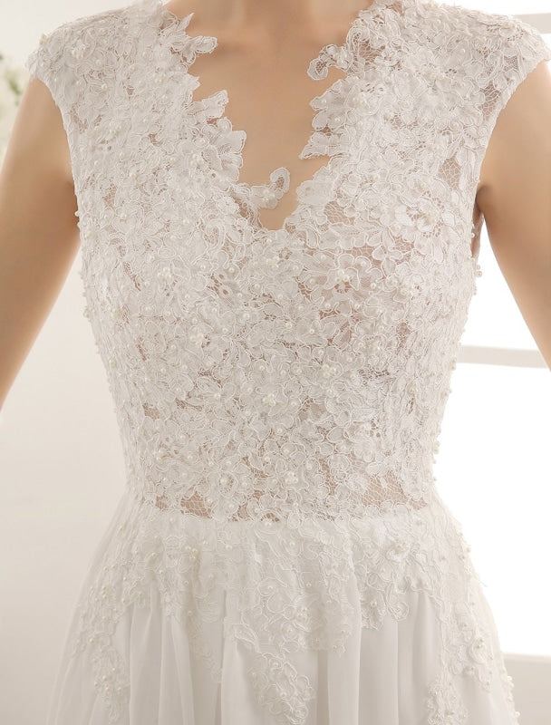 Vintage Chiffon V Neck Beach Bridal Dress with Pearls and Lace