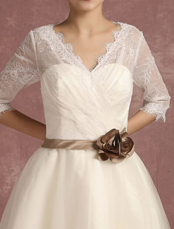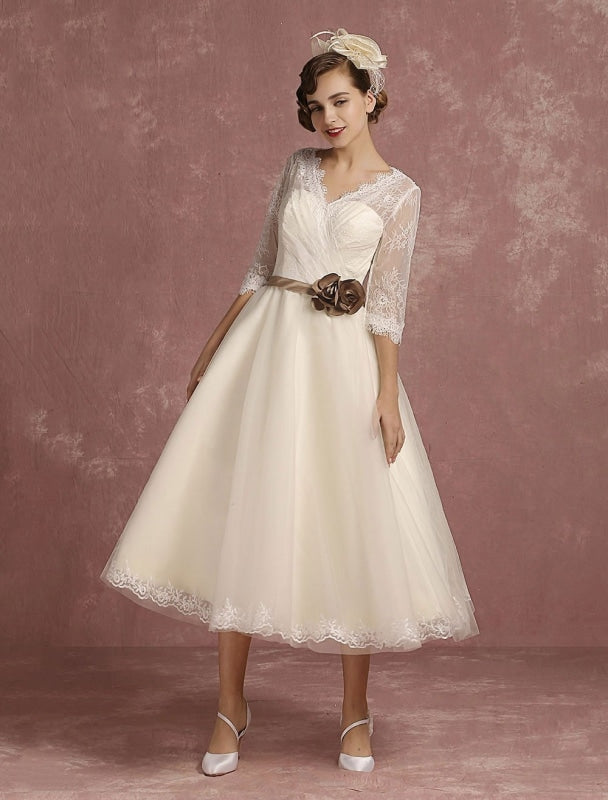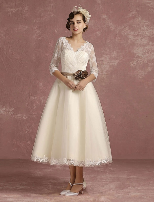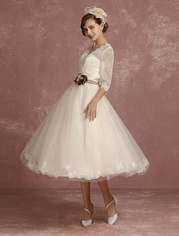 Vintage Short Lace Tulle Bridal Dress with Half Sleeves and V-Neck Classic Tea Length Gown