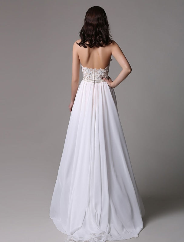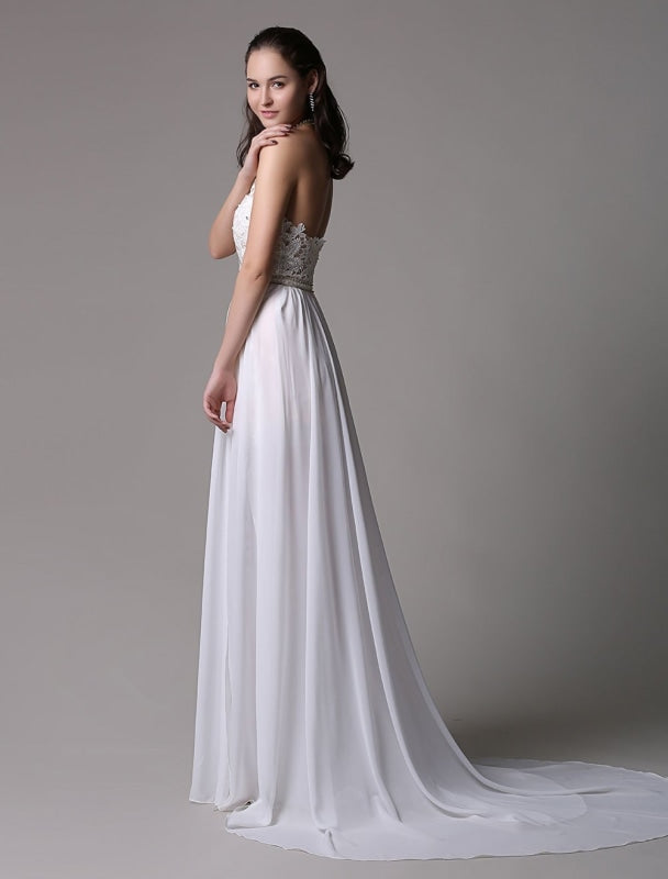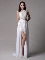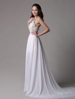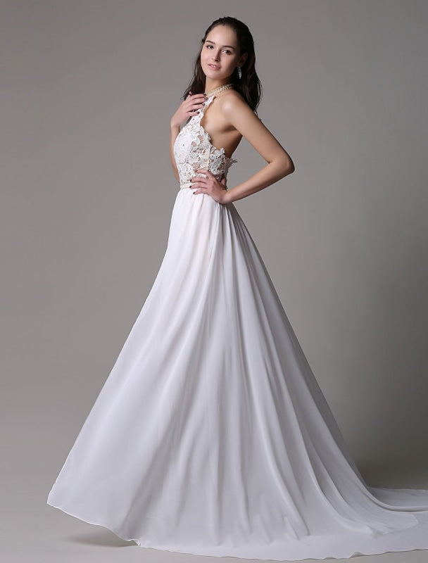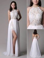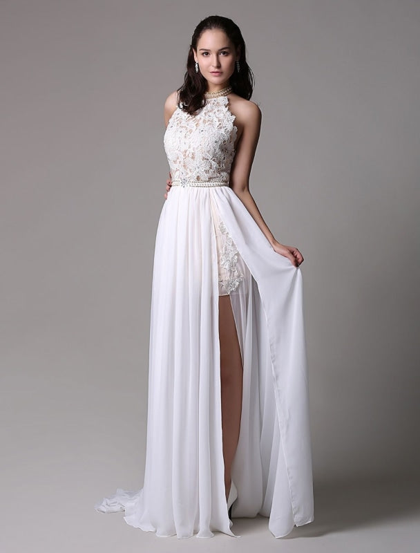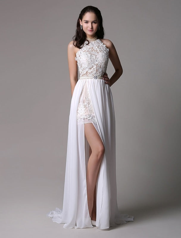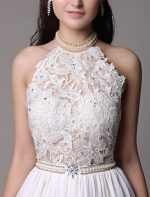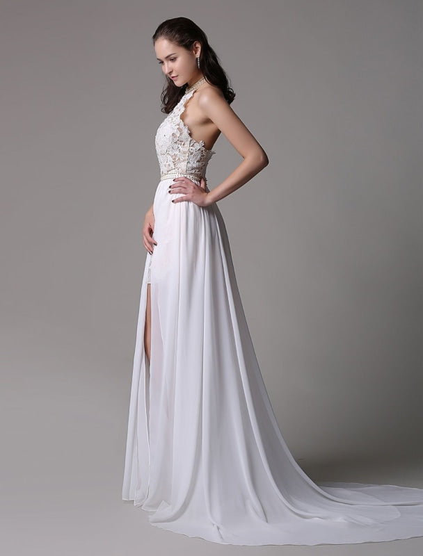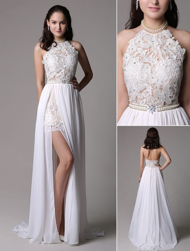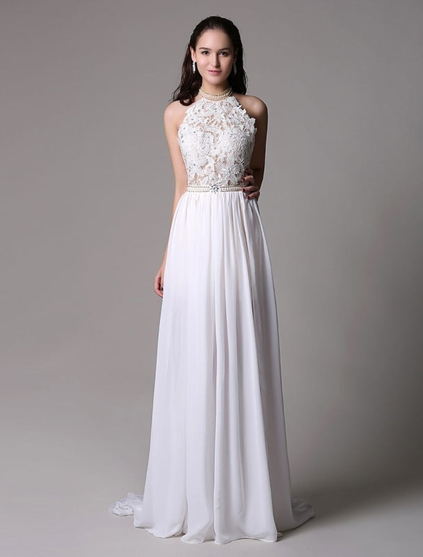 Vintage White Halter Ivory Prom Dress with Lace Applique and Beading